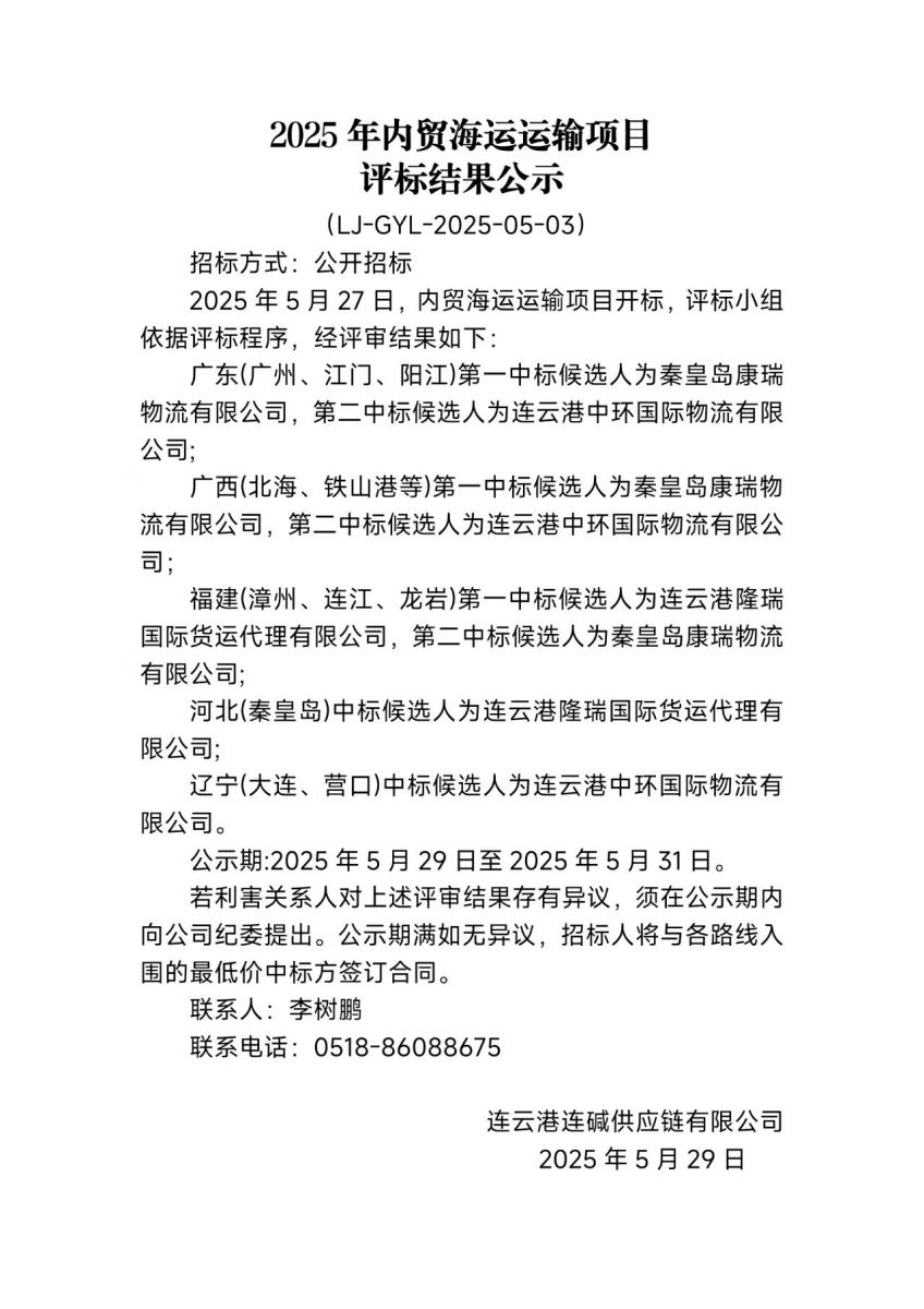 連云港連堿供應鏈有限公司2025年內貿海運運輸項目評標結果公示