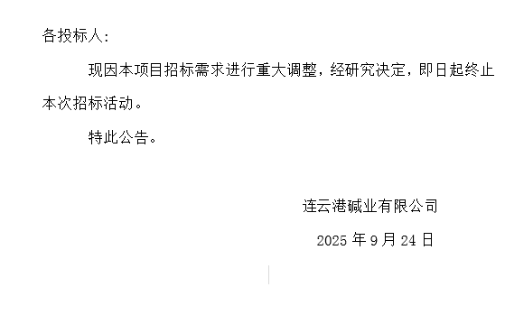 關于連云港堿業有限公司化工輔料甲醇采購終止招標的公告