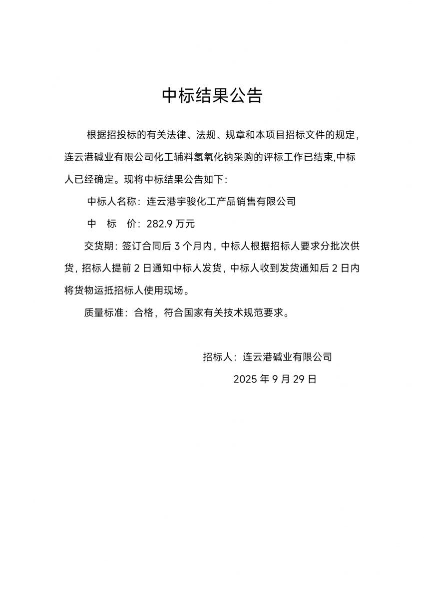 連云港堿業有限公司化工輔料氫氧化鈉采購中標結果公告