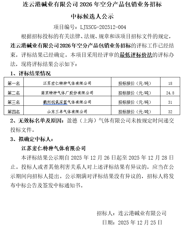 連云港堿業有限公司2026年空分產品包銷業務招標中標候選人公示