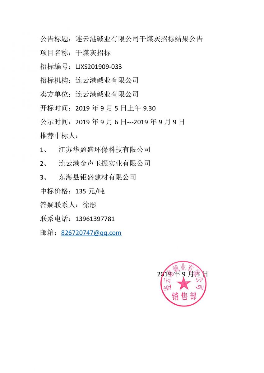 連云港堿業有限公司干煤灰招標結果公告