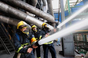 公司黨委書記、董事長張衛民,黨委副書記、總經理李清菊,副總經理焦旺盛參加演練并提要求。健康安全環保部消防隊、熱電車間抽調精兵強將參加這次突發事件應急預案實戰演練。