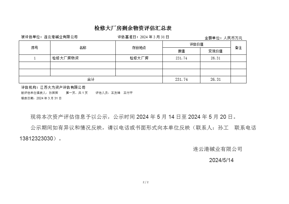 檢修廠房及鋼材庫物資資產評估公示