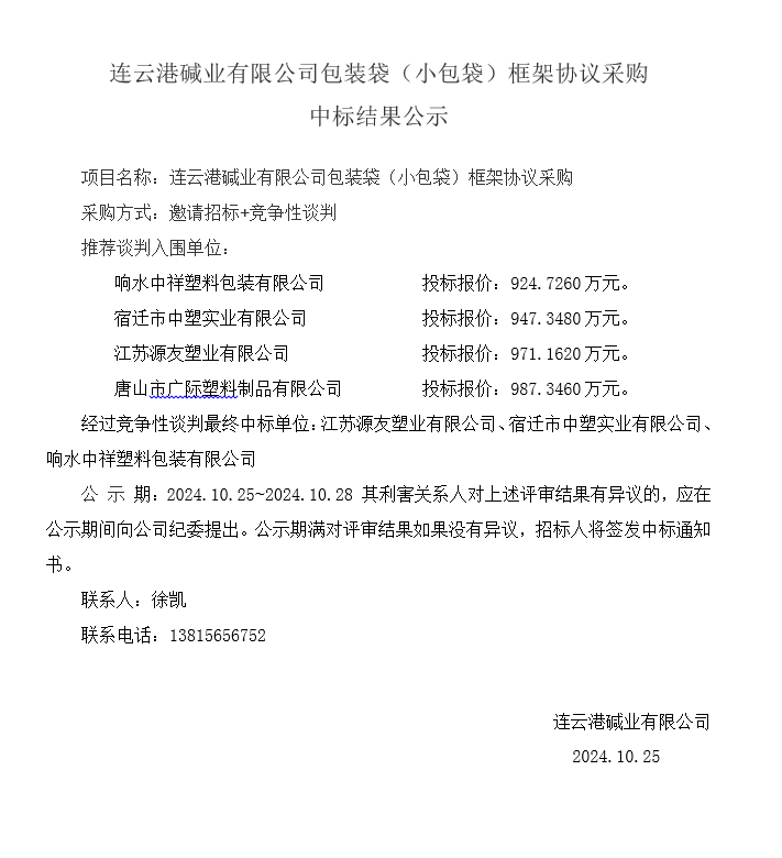 連云港堿業(yè)有限公司包裝袋(小包袋)框架協(xié)議采購中標(biāo)結(jié)果公示