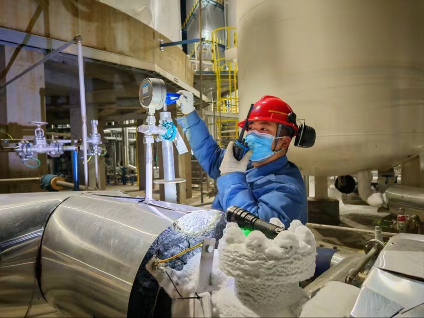 “春節(jié)期間,我們一定堅(jiān)守崗位,保持最佳狀態(tài),確保各項(xiàng)工作有序推進(jìn)。” 空分車間員工堅(jiān)定地說道。“春節(jié)期間更要打起十二分精神,不能有絲毫懈怠。” 他們密切關(guān)注著設(shè)備的運(yùn)行參數(shù),仔細(xì)記錄著每一個(gè)數(shù)據(jù)。“走,除夕夜檢查不能停,一定要確保萬無一失。”夜色中,他們頂著瑟瑟寒風(fēng)認(rèn)真巡檢,檢查空壓機(jī)運(yùn)行狀態(tài),保障儀表氣穩(wěn)定供應(yīng)。為了確保后序工段氮?dú)獯祾吆兔芊鈿夤?yīng),空分車間定時(shí)對(duì)真空液氮儲(chǔ)槽進(jìn)行充液,為氮?dú)夤?yīng)保駕護(hù)航。