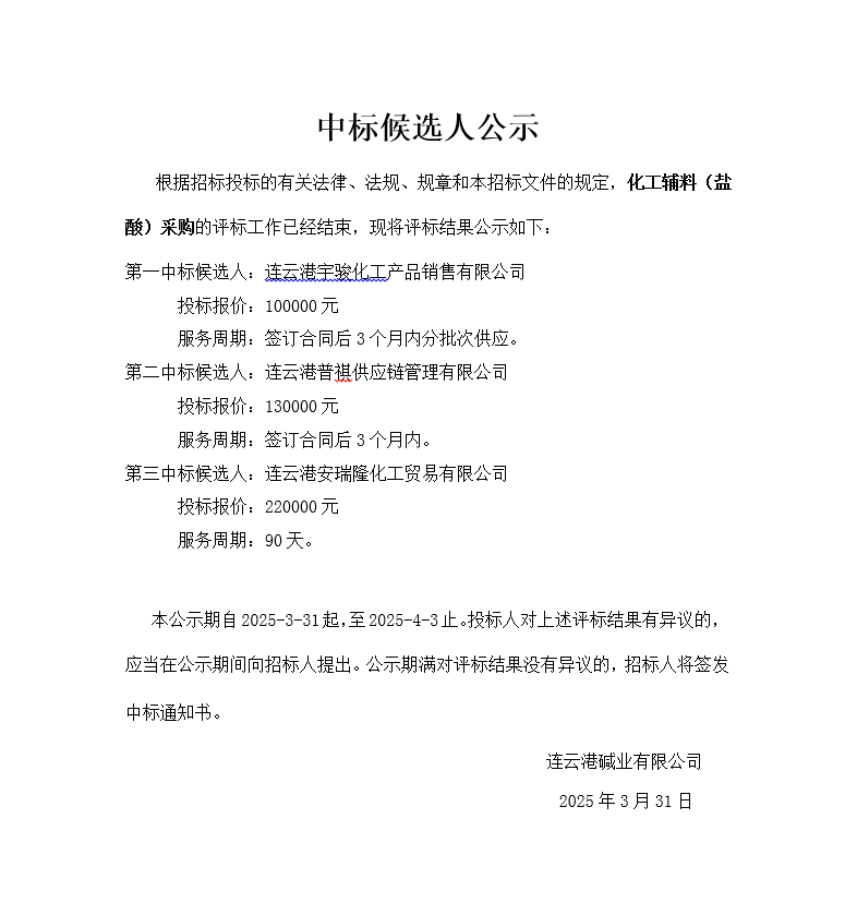 化工輔料鹽酸采購(gòu)中標(biāo)候選人公示