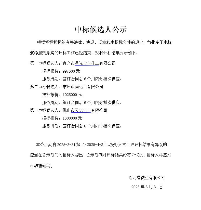 氣化車間水煤漿添加劑采購(gòu)中標(biāo)候選人公示